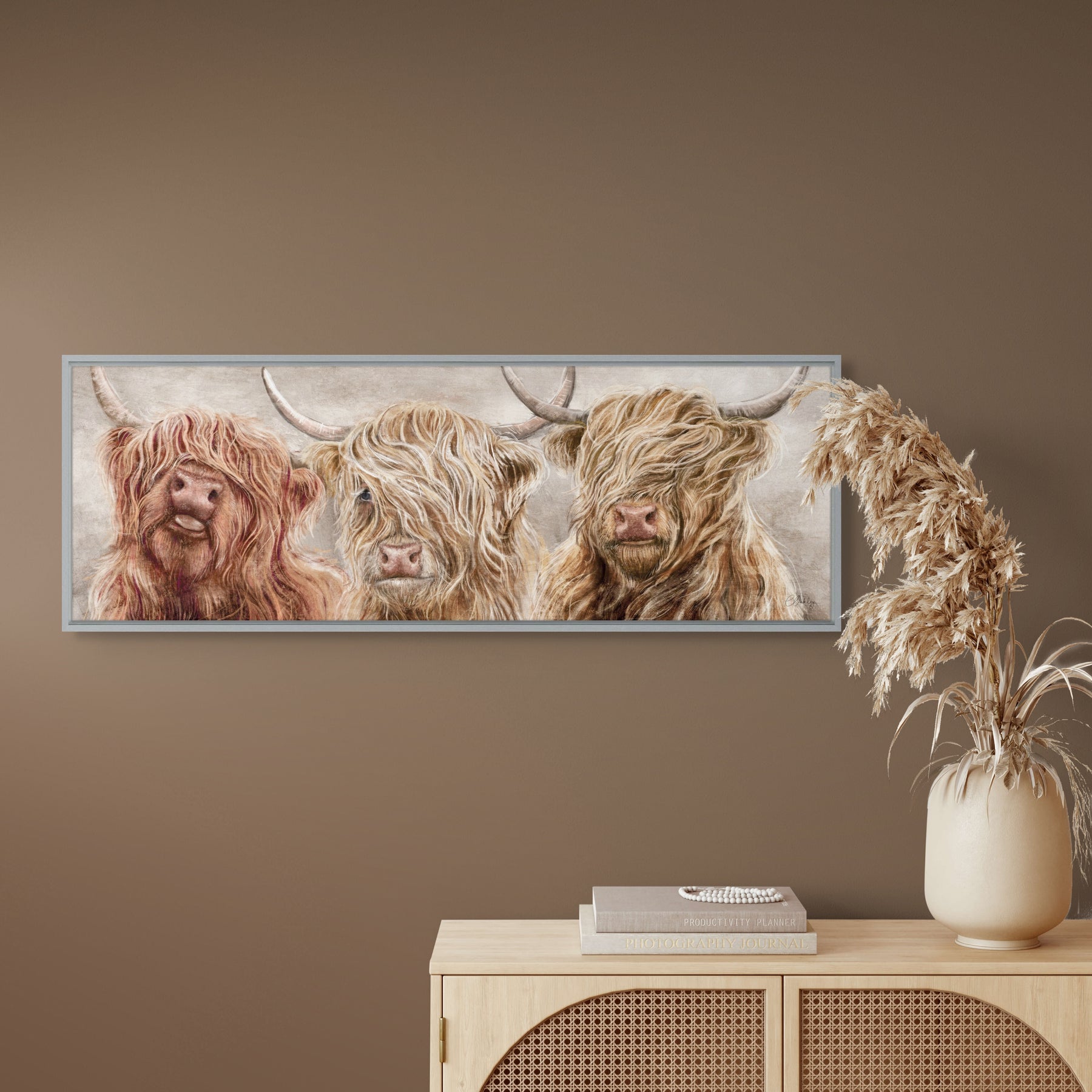 This playful set of three, measuring 124 by 44 cm, is presented in a soft silver-grey floating frame that adds a contemporary touch. Each cow has its own unique character: the happy one, the gentle one, and the slightly moody one, making it a perfect combination for a feature wall.