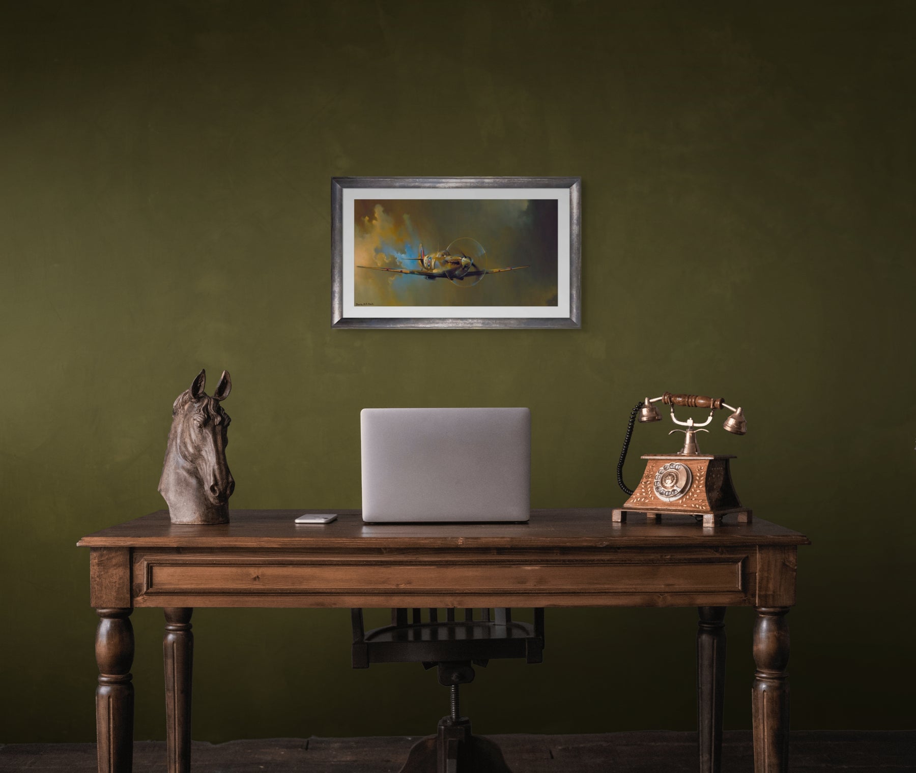 A powerful portrayal of the legendary Spitfire soaring through dramatic skies. Barrie A.F. Clark’s attention to light and detail brings the aircraft to life, capturing both its speed and historic significance. Finished in a smart metallic-effect frame with a white mount, this striking piece is perfect for aviation enthusiasts and collectors alike.