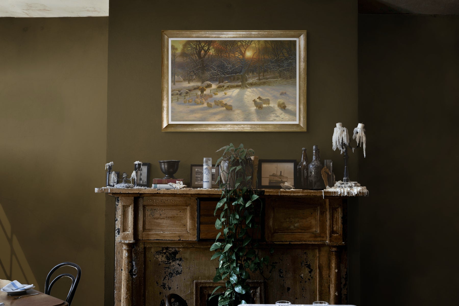 One of Joseph Farquharson’s most celebrated winter scenes, A Shortening Winter’s Day captures the fading glow of a snowy afternoon in the Scottish countryside. A shepherd leads his flock across the fields as the low sun casts golden light through the trees, creating long, soft shadows across the snow. Farquharson’s unmatched skill with atmosphere and light brings both beauty and stillness to this timeless rural moment.